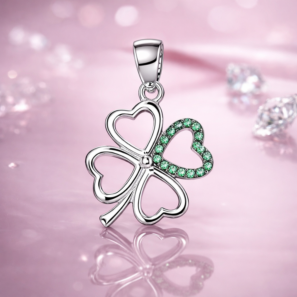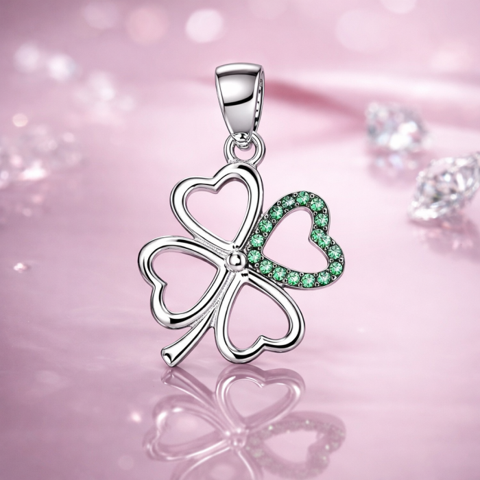 Pandantivul din argint cu design de trifoi cu patru foi este un talisman special, încărcat cu simbolism și semnificații pozitive. Trifoiul cu patru foi este adesea asociat cu norocul și fericirea, fiind considerat un amulet protector și aducător de prosperitate.